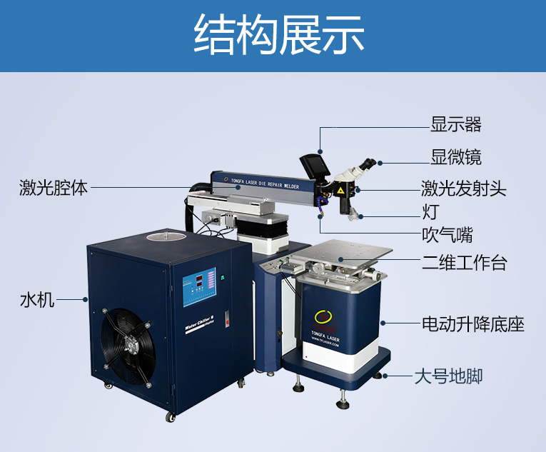 出口型模具激光焊機是通發激光公司專門為出口國外客戶使用而設計的系列機型TFL-200E,適用于各類精密注塑模具、壓鑄模具等模具激光修補焊接;同時也適合鑄件沙孔激光修補、模具崩缺激光修復、過切加工等的激光修補;各類金屬結構件、金銀首飾的激光焊接加工。